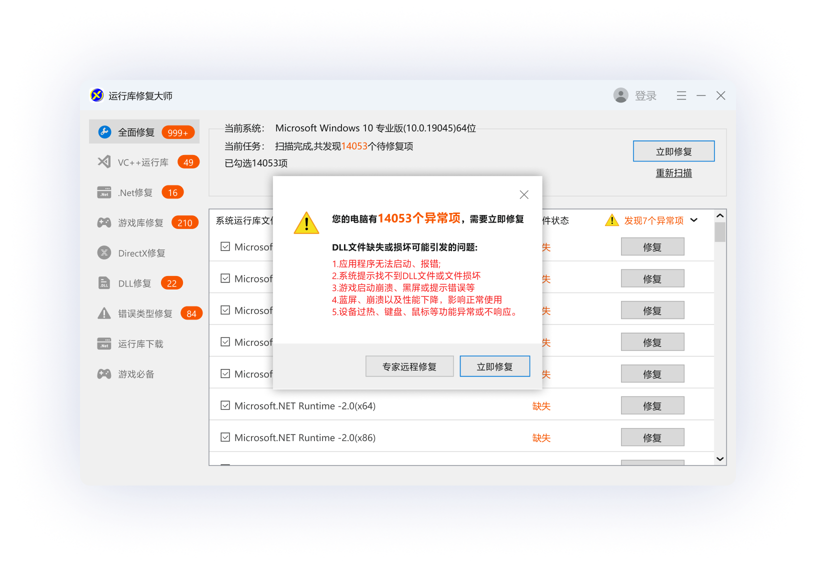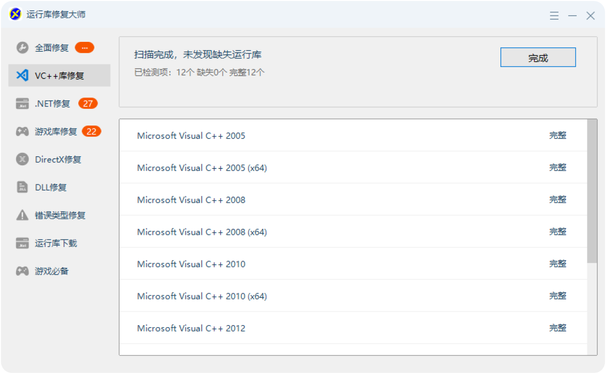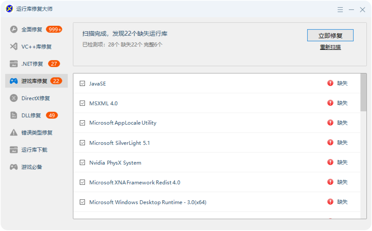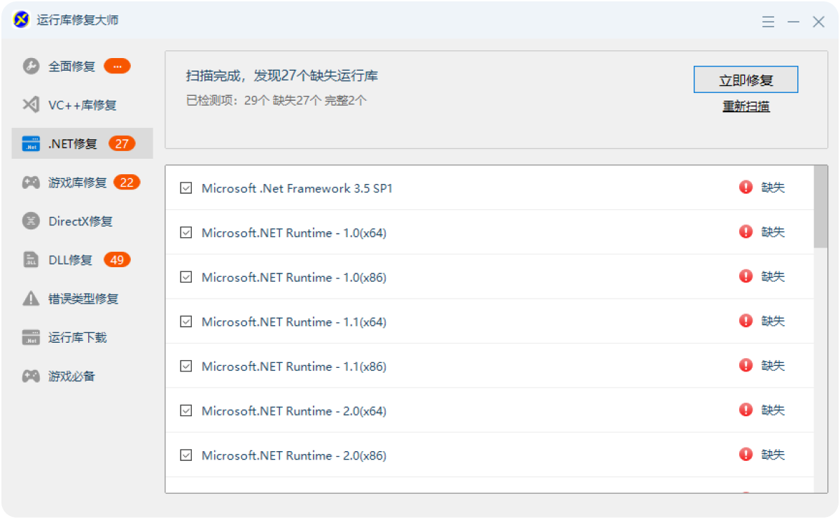 不用手动判断,直接下载修复工具,点击"立即修复",工具会自动检测并安装所有缺失的版本,比手动选择更准确。