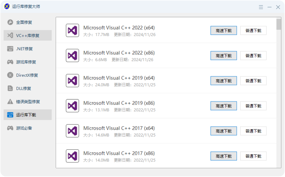 如果自动修复未能解决问题,可以在"运行库下载"区域手动下载对应版本的安装包,按提示安装即可。常见报错的修复成